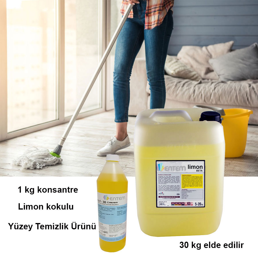1 adet 1 litrelik konsantre limon beta parfümlü yüzey temizlik ürünü 30 litrelik suda açıldığında Endüstriyel hoş kokulu yüzey temizleyici elde edilir.30 litrelik açılan yüzey temizleyici 15 litrelik temizlik arabası kovasına 200 ml kullanılır.