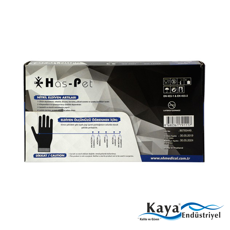 Has-pet Çok Amaçlı Siyah Nitril Eldiven mutfakta,temizlikte ve kozmetikte kullanım için uygundur. İhtiyacınıza uygun siyah, mavi veya beyaz Haspet Nitril Eldivenleri satın alabilirsiniz.Lateks içermediği için, latekse duyarlı bünyeler için tercih edilir.Parmak uçlarındaki dokulu yüzey,hem kuru hem ıslak maddelerin daha sıkı kavranabilmesini sağlar.Gıdaya uygunluğu vardır.İki ele uyumludur, elin şeklini alarak kolay hareket imkanı sağlar Tek kullanımlıktır Kullanat üründür Terleme yapmaz Kutuda 100 adet.Stoklarımızda Large,Medium ve small bedenler bulunur.