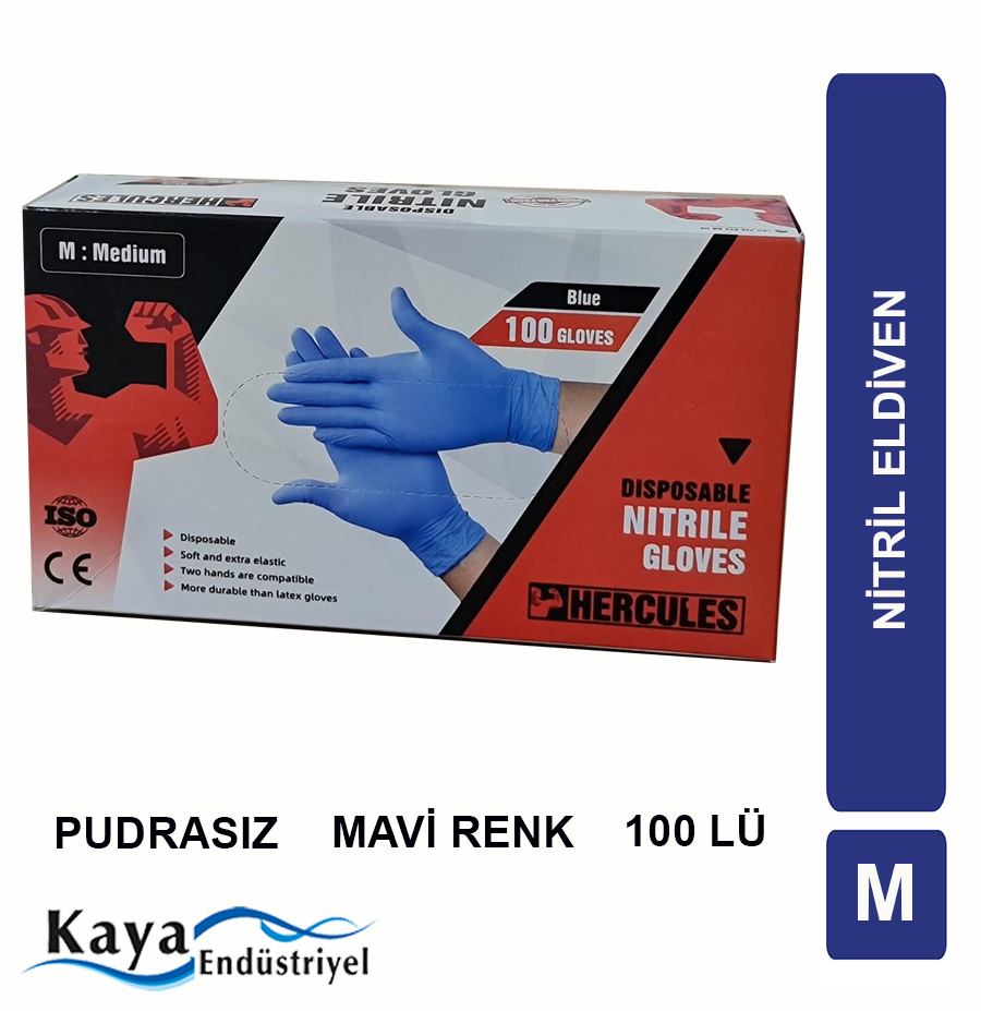 Hercules Nitril Eldiven Pudrasız Mavi Medium çok amaçlı eldive 100 lü paketlerde.En çok beğenilen ve tercih edilen eldiven kayaend.com da