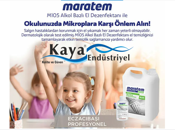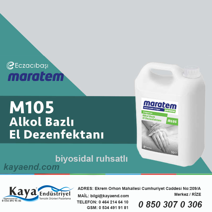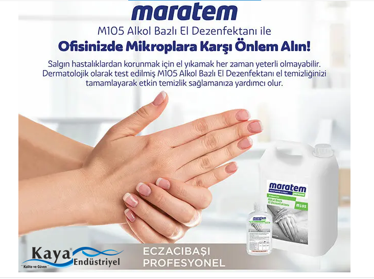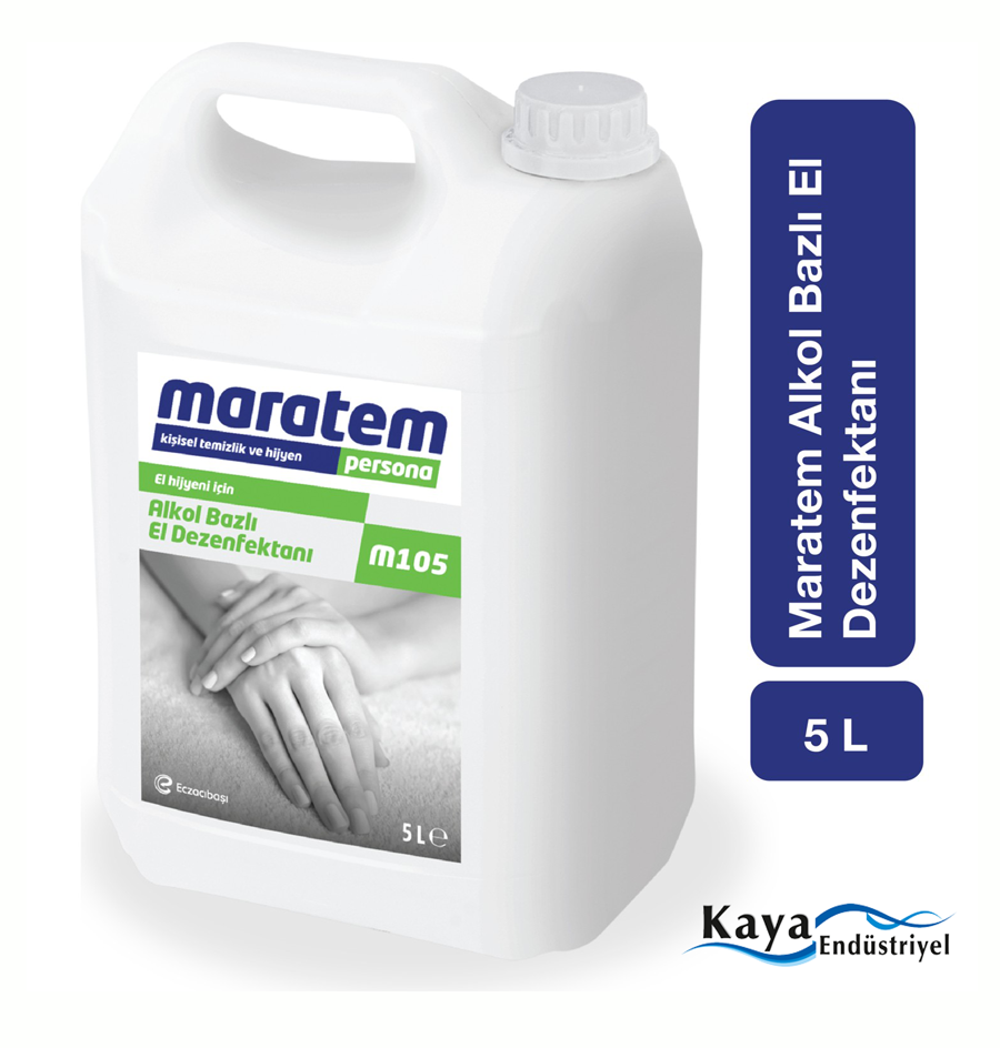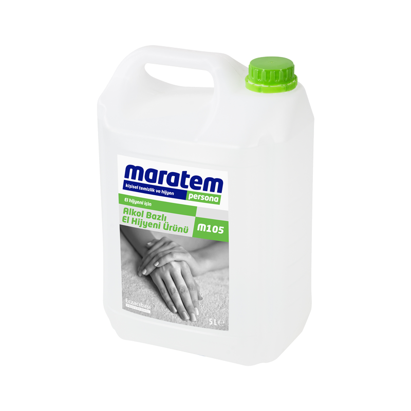 Maratem M105 Alkol Bazlı El Dezenfektanı 5lt işletme,okul,kurum vb yerlerde çalışanların iş baslangıcında ve iş süresinde çalışanların elleri için hızlı ve etkin bir antibakteriyel dezenfeksiyon temin etmek için geliştirilmiş el dezenfeksiyon maddesidir.